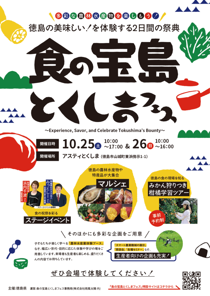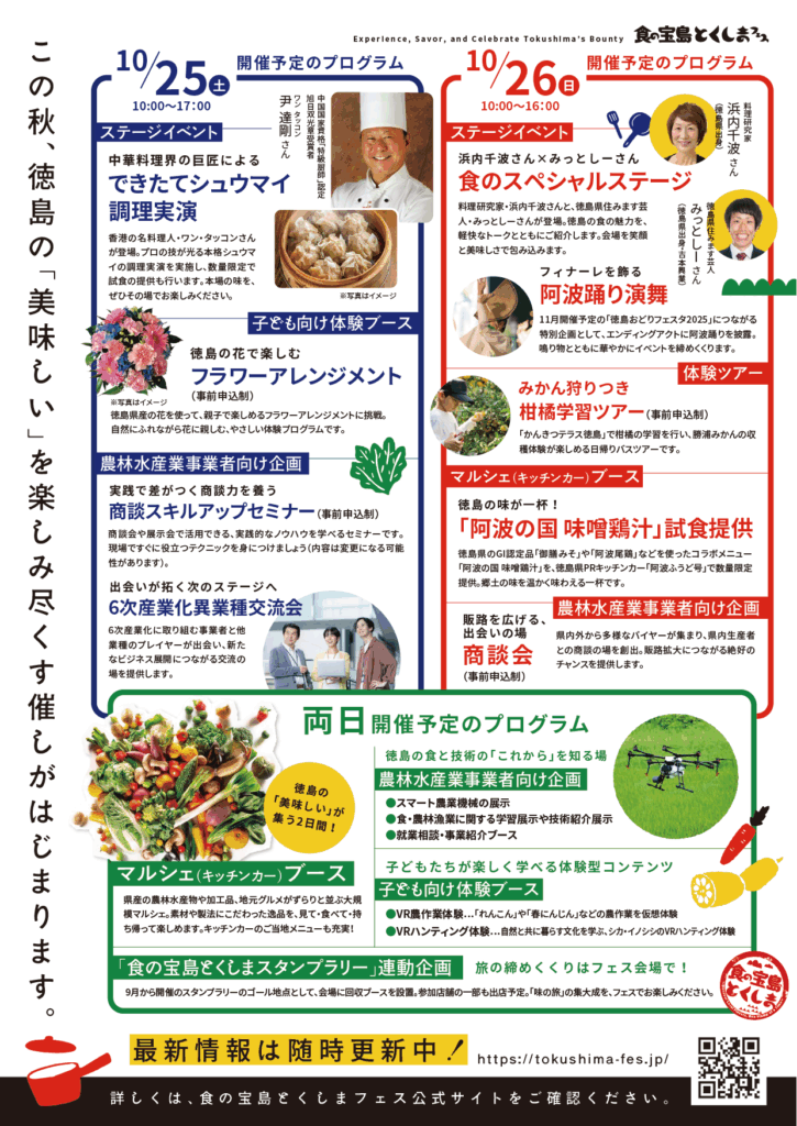 徳島食材のマルシェやキッチンカーの出店、料理実演とトークショー、阿波踊りなどのステージイベント、農漁業体験ツアー、農林水産業の機械展示、フードテック展示、就業相談ブース、農林漁業者向けセミナー&商談会など。盛沢山のイベントです。